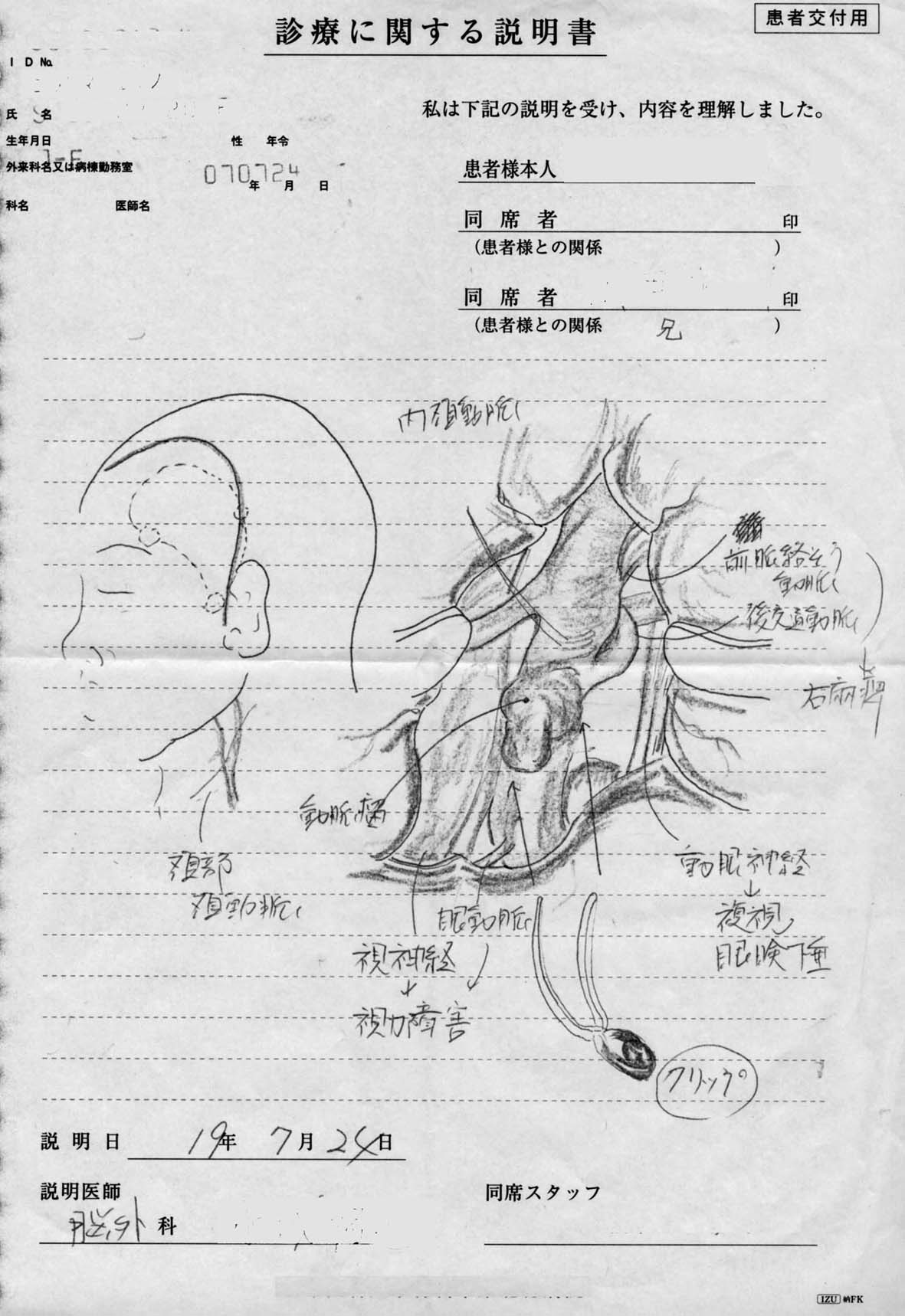 2007.07.10 K先生が出張執刀してくれる、家から20キロ程度のH病院脳神経外科を受診した。 紹介されたM先生は、A病院でK先生の元で修行し、 モンゴリアンブラザーズと呼ばれていた、なんてジョークを交えて話をした。 チームワークもOKだ。 術後のフォローを考え、脳神経外科医が多く常駐しているH病院にしてもらったのは、大正解とのこと。 「安心してください」には、本当にホッとした。 後は、先生同士のスケジュール調整で決ることになるんだ。 K先生はなんとか7月中、とおっしゃってくれているが、難しいかな? もう「まな板の上の鯉」(トドの方が近い?)、全てを委ねるしかないね。 でもでもでもでもでも・・・1-2%の死、3%の後遺症(一時的を含む)が頭をかすめる。。。